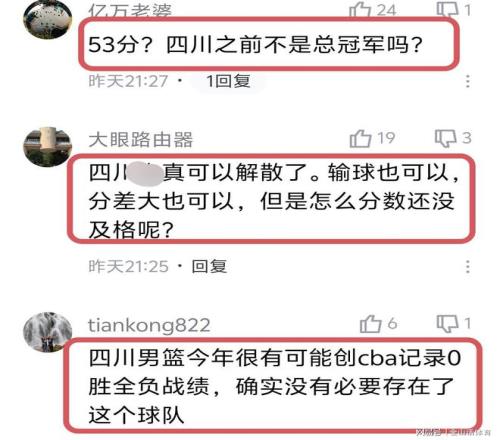 四川队如今糟糕的表现,也引来球迷的纷纷吐槽。“这种队有什么存在的必要呢?还不如滚让香港金牛递补打呢”;“53分?四川之前不是总冠军吗?”;“四川队真可以解散了。输球也可以,分差大也可以,但是怎么分数还没及格呢?”;“四川男篮今年很有可能创cba记录0胜全负战绩,确实没有必要存在了这个球队”。