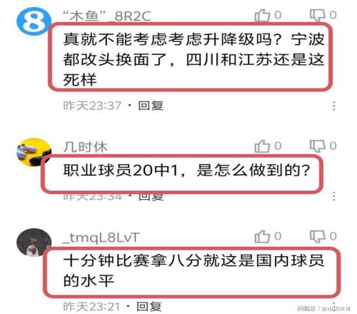 “真就不能考虑考虑升降级吗?宁波都改头换面了,四川和江苏还是这死样。”;“职业球员20中1,是怎么做到的?”;“十分钟比赛拿八分,就这是国内球员的水平。”;“四川队是不是想让CBA难堪啊,毕竟职业联赛随便用个外援也算面上过得去啊!”;“这群混子存在的意义是什么”;“这群混子存在的意义是什么?”……