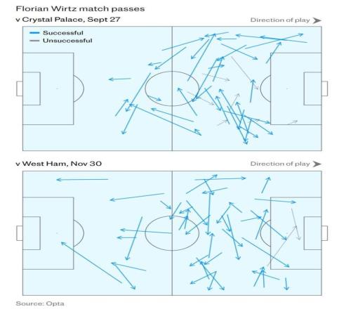维尔茨在德甲和国家队有过从边路内切进攻的历史,斯洛特在利物浦也曾这样使用他,但这并非俱乐部引进他的初衷。与本赛季早些时候客场对阵水晶宫那场效率低下的比赛相比,本场最显著的变化是维尔茨频繁出现在左路及肋部区域,他与加克波以及左后卫凯尔凯兹形成了良好的连线。