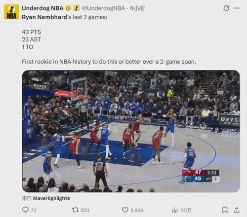 NBA从来不缺“小人物”逆袭的故事,今天聊一聊独行侠新秀瑞安-内姆哈德,他是步行者后卫安德鲁-内姆哈德的亲弟弟。最近两场比赛,瑞安-内姆哈德一共拿到43分22助攻,只出现1次失误,成为NBA首个达成这一数据的新秀。